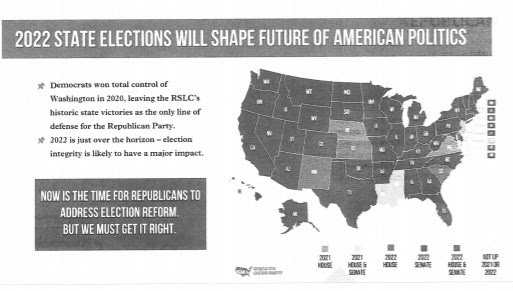 The RSLC presentation deck makes clear that the purpose of restricting voting under the guise of "election integrity" is to elect more Republicans. One slide asserts that Republican control of state legislatures is the "last line of defense for the Republican Party." The RSLC argues that Republicans must act "now" because "2022 is just over the horizon — election integrity is likely to have a major impact."