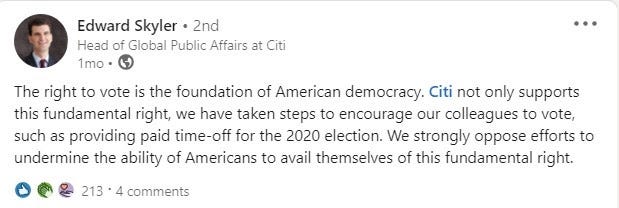 Citi was also listed as participating in the April 6 meeting, according to the agenda. In a LinkedIn post last month, Citi's Head of Global Public Affairs, Edward Skyler, said the company believes "the right to vote is the foundation of American democracy" and "strongly" opposes "efforts to undermine the ability of Americans to avail themselves of this fundamental right."