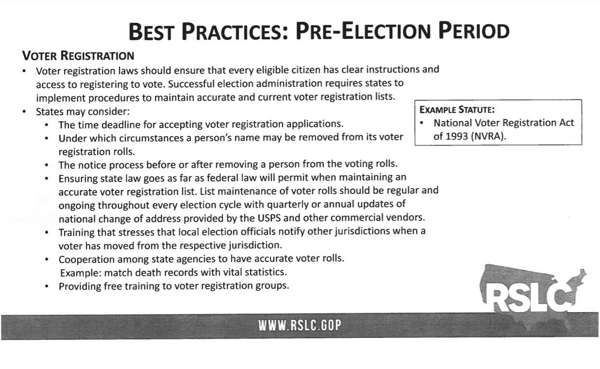 The plan presented to the RSLC's corporate partners in April advocates for the purging of voter rolls "as far as federal law permits." The group advocates removing voters based on data from the USPS, state agencies, and commercial vendors.