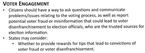 The presentation also advocates for stricter voter ID requirements, which makes voting more difficult for people who lack the required identification. After Election Day, the RSLC presentation suggests states provide bounties to citizens who come forward with evidence of fraud.